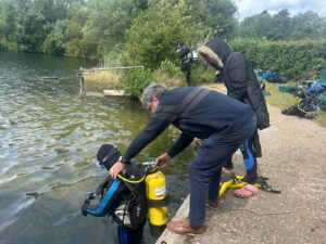 On Saturday the 7th of June Brentwood Selo returned to the dive site at Leybourne Lakes in Kent. Although limited to a maximum depth of 10 meters it is ideally set up in close proximity (under an hour away) for introducing divers to open water and provides opportunities for training Ocean Divers, instructors under training, buoyancy and dry suit skills. The diving area is in a dedicated lake within the Leybourne Lakes country park with a separate dedicated access, good parking facilities, nearby toilets (Portaloo) and a secured lake access point. The club has access to combinations for the access gate, toilets and diving area and, subject to booking, can use the facility at any time (including night diving). During normal day hours there is a café and toilets a short drive away at the Leybourne Water Sports centre. The cost for divers is £14 per day with BSAC Open Water Instructors gaining free admission. Dependant on traffic at the Elizabeth Bridge the journey time to the Lakes is about 50 minutes from Brentwood.