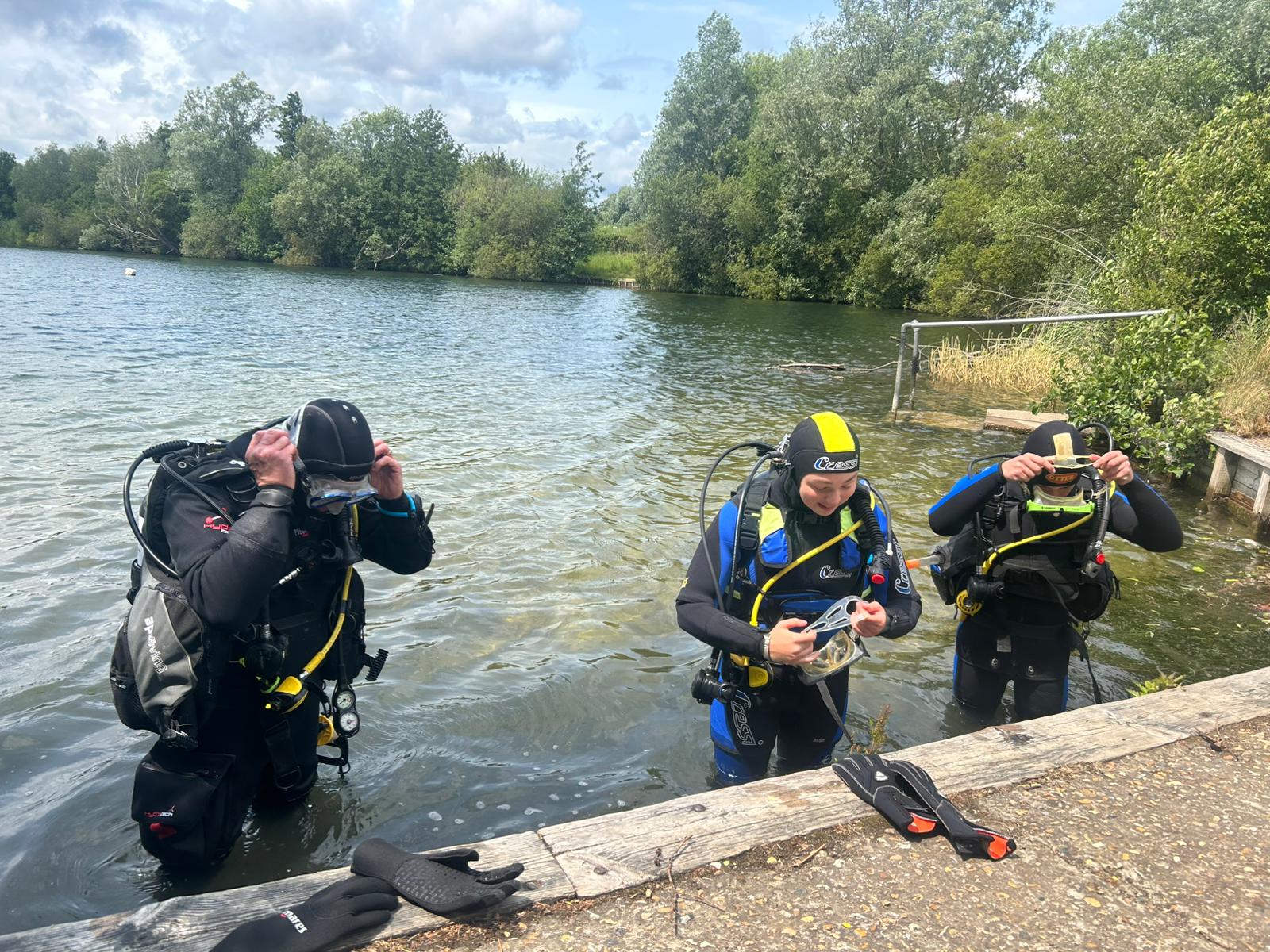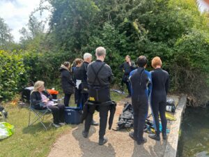 On Saturday the 7th of June Brentwood Selo returned to the dive site at Leybourne Lakes in Kent. Although limited to a maximum depth of 10 meters it is ideally set up in close proximity (under an hour away) for introducing divers to open water and provides opportunities for training Ocean Divers, instructors under training, buoyancy and dry suit skills. The diving area is in a dedicated lake within the Leybourne Lakes country park with a separate dedicated access, good parking facilities, nearby toilets (Portaloo) and a secured lake access point. The club has access to combinations for the access gate, toilets and diving area and, subject to booking, can use the facility at any time (including night diving). During normal day hours there is a café and toilets a short drive away at the Leybourne Water Sports centre. The cost for divers is £14 per day with BSAC Open Water Instructors gaining free admission. Dependant on traffic at the Elizabeth Bridge the journey time to the Lakes is about 50 minutes from Brentwood.